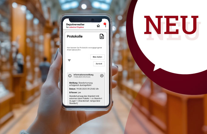 Mit der robotron*Daphne Depotverwalter App stellt Robotron eine neue mobile Lösung für die digitale Depotverwaltung vor. Die Webanwendung ermöglicht es, Objekt- und Standortbewegungen direkt vor Ort per Scan zu erfassen. Ob Umlagerungen, Inventuren oder Leihbewegungen: Alle Depotprozesse werden lückenlos dokumentiert und automatisch in robotron*Daphne übernommen. Dank der webbasierten Anwendung ist die App ohne Installation sofort einsatzbereit und auf Smartphones sowie Tablets flexibel nutzbar.